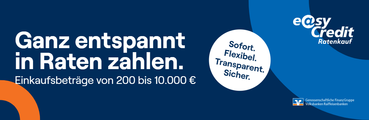 Mit ratenkauf by easyCredit profitieren Sie gleich mehrfach von einer bequemen und fairen Ratenzahlung. Ganz ohne versteckte Kosten, Gebühren und lästigen Papierkram. Wählen Sie im Bezahlvorgang einfach ratenkauf by easyCredit aus und zahlen Sie die erste Rate frühestens nach 30 Tagen. Wenn Sie später schneller zurückzahlen oder eine Zahlpause einlegen wollen – auch das geht ganz einfach und flexibel.